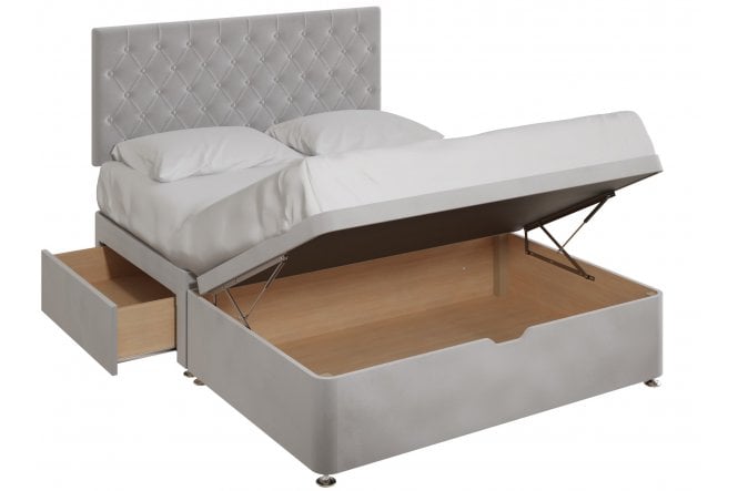 The luxury Maple half end lift ottoman, combined with two large drawers is upholstered in a choice of 40+ fabrics. Made by master craftsman in our Midlands based workshop. Delivered in two halves, for ease of transportation and delivery. Solid wooden construction, with a platform top creating the perfect sleep surface.